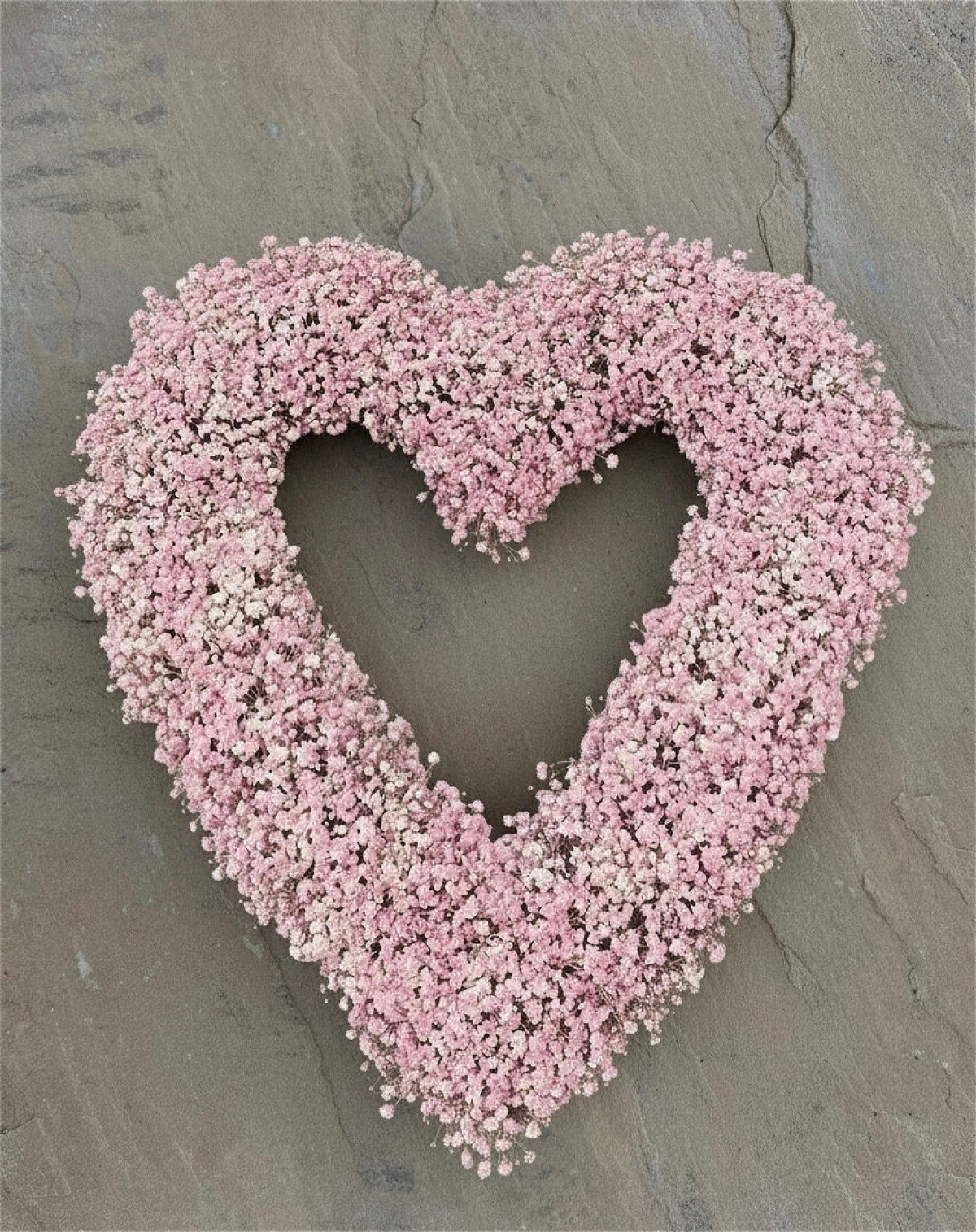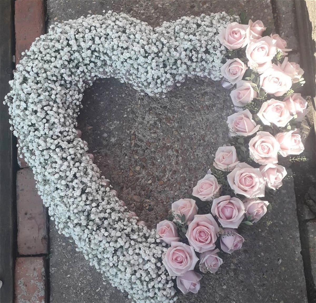 Open heart made up of Gypsophilia also known as baby's breath, a simple yet elegant design to honour a loved one. Please choose your preferred colour by using the drop down menu, the heart is approx 17inch. The image shown is an example and not exact, meaning flower sizes/shapes/varieties may differ due to seasonal availability.