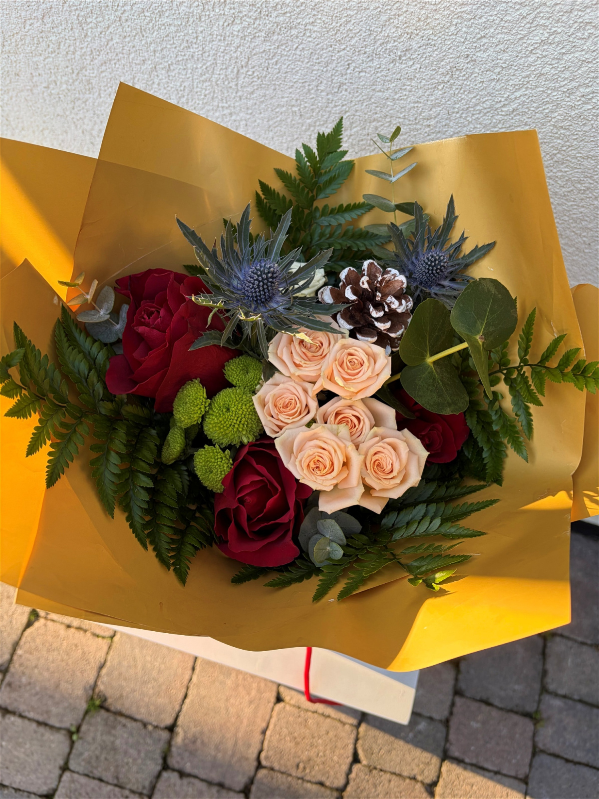Our winter wonderland bouquet brings the seasonal magic to life with a mixture of deep tones. The image shows size standard, your bouquet will include wrapping, a floral box and a clear cellophane aqua wrap with water to keep the stems hydrated. The image shown is an example and not exact, meaning flower sizes/shapes/varieties may differ due to seasonal availability.