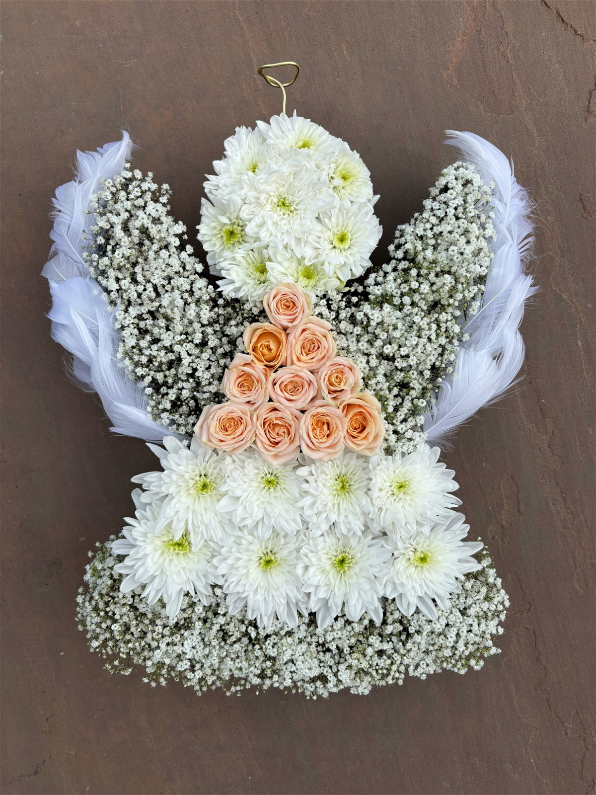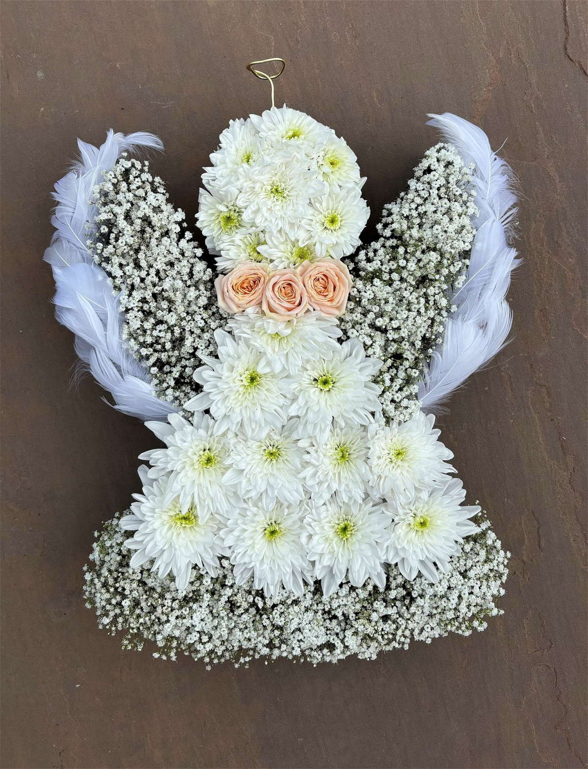 Our delicate angel comes in varied styles, a beautiful goodbye tribute for a loved one. Sizing approx 26x33cm, each angel is hand crafted and made with care. If you wish to change the colours of the roses, please leave a note in the text box and we can change this for you.