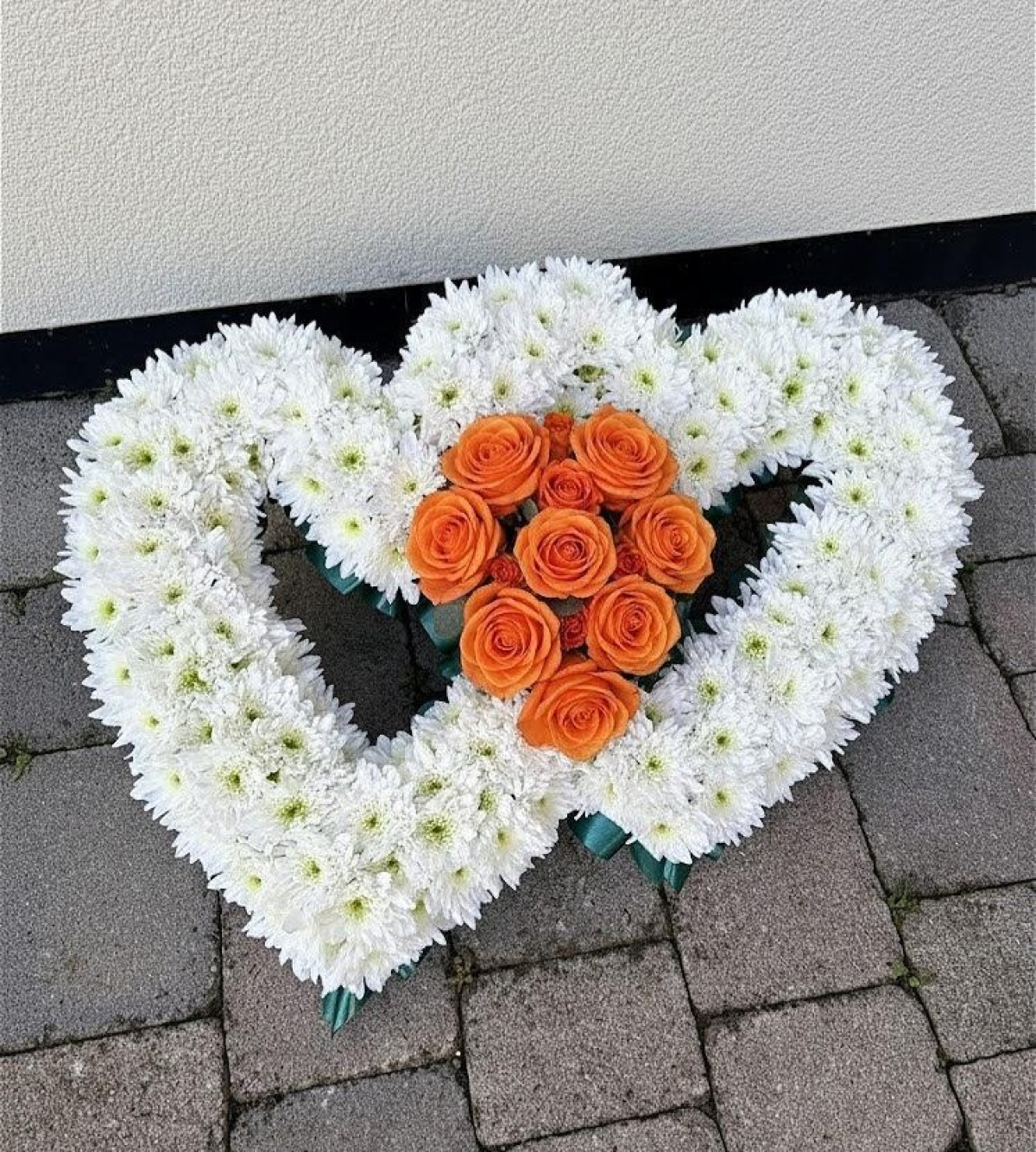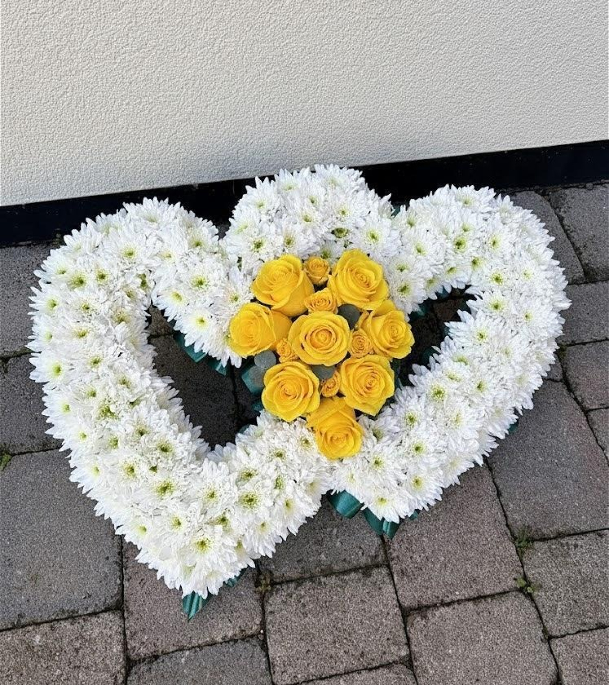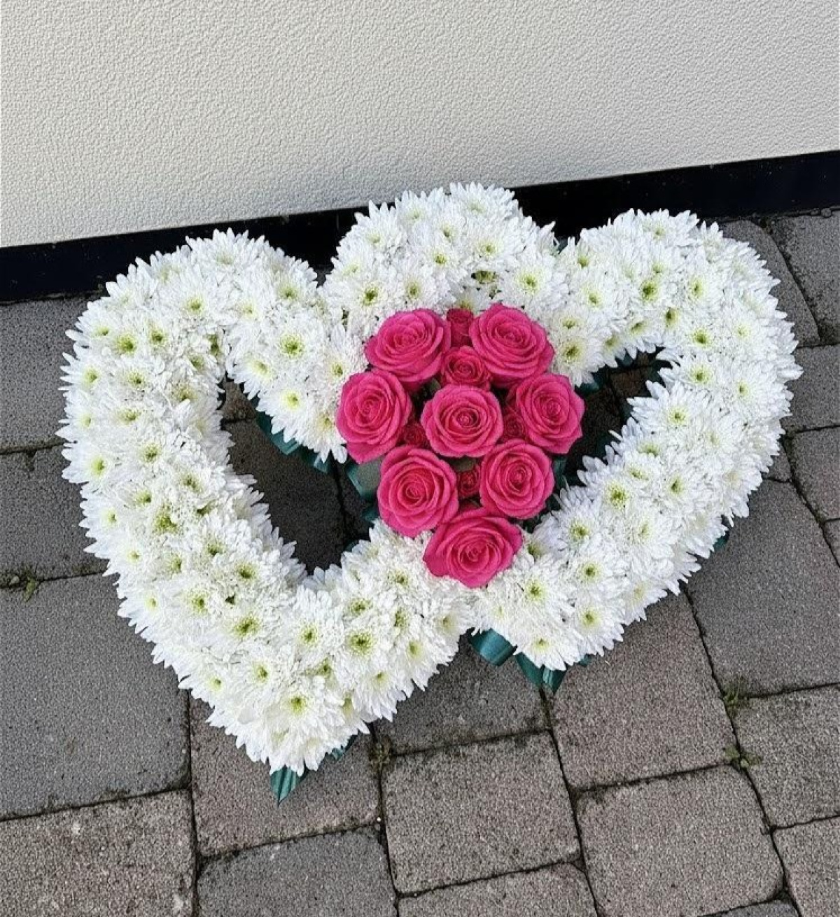 Open double heart is made up of white chrysanthemums, floral spray and a ribbon edging. The arrangement is approx 40cm X 60cm. Please choose your preferred colour choice by using the drop down menu. The image shown is an example and not exact, meaning flower sizes/shapes/varieties may differ due to seasonal availability.