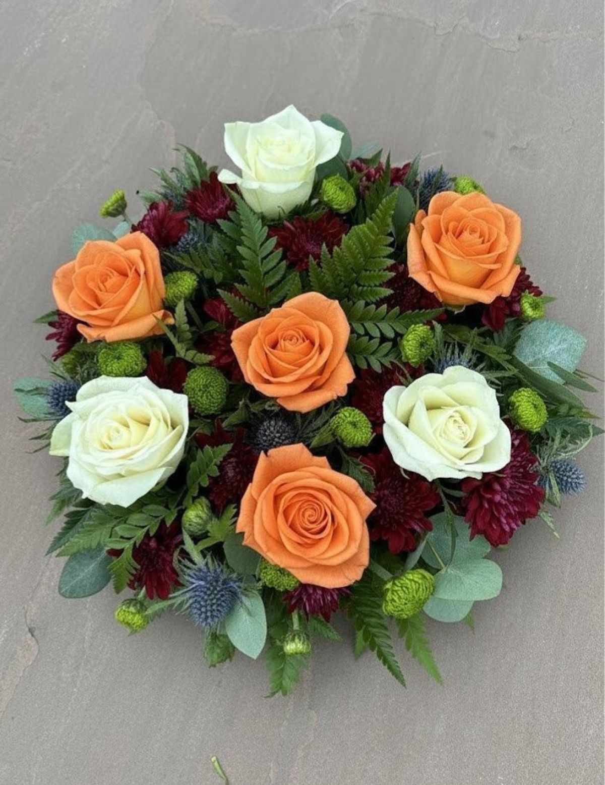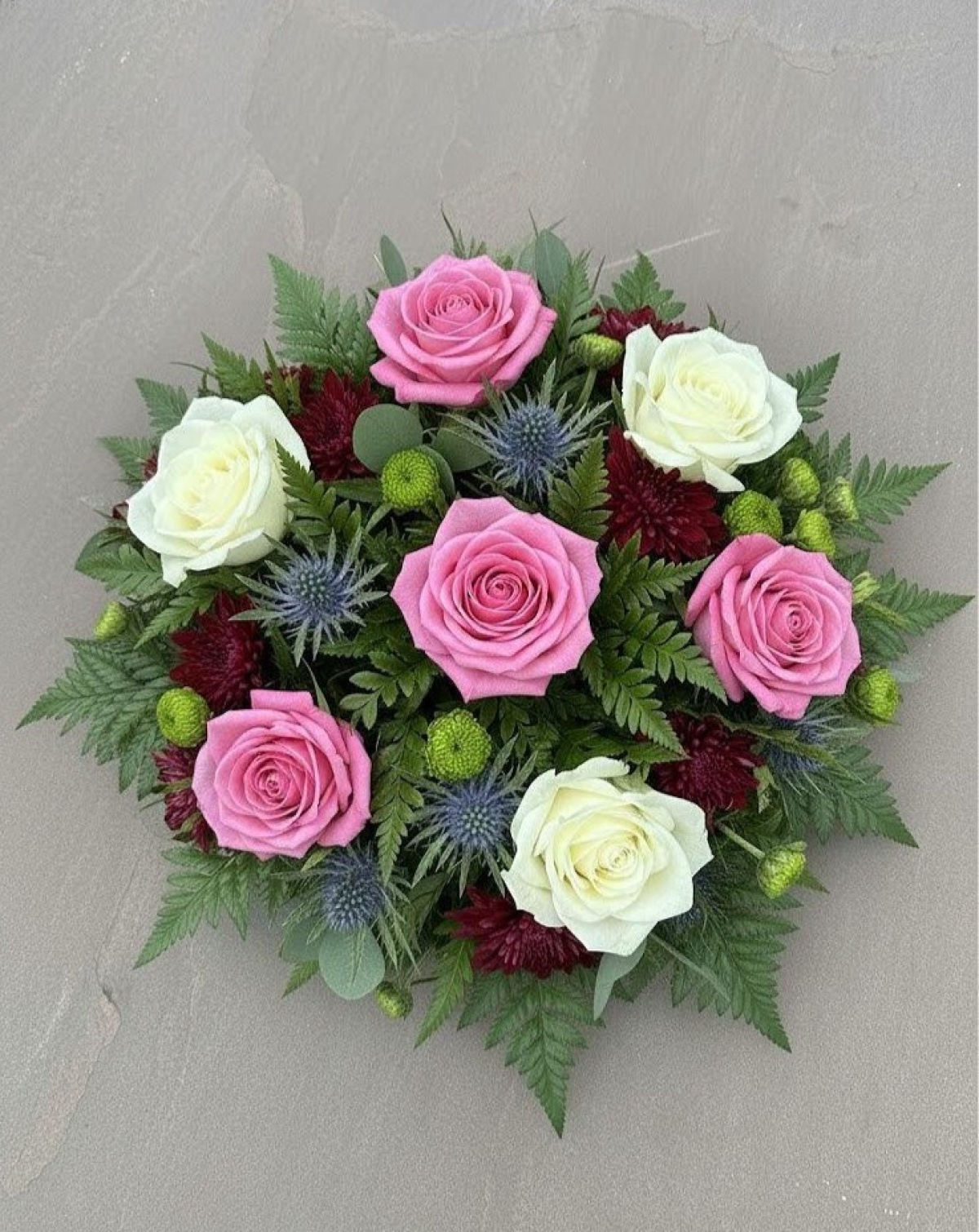 Our circular posy arrangement is an elegant way to honour a loved one, it is made up of fresh flowers and foliage. You can choose from a range of styles and colours by selecting the different options on the drop down menu. The image shown is an example and not exact, meaning flower sizes/shapes/varieties may differ due to seasonal availability.