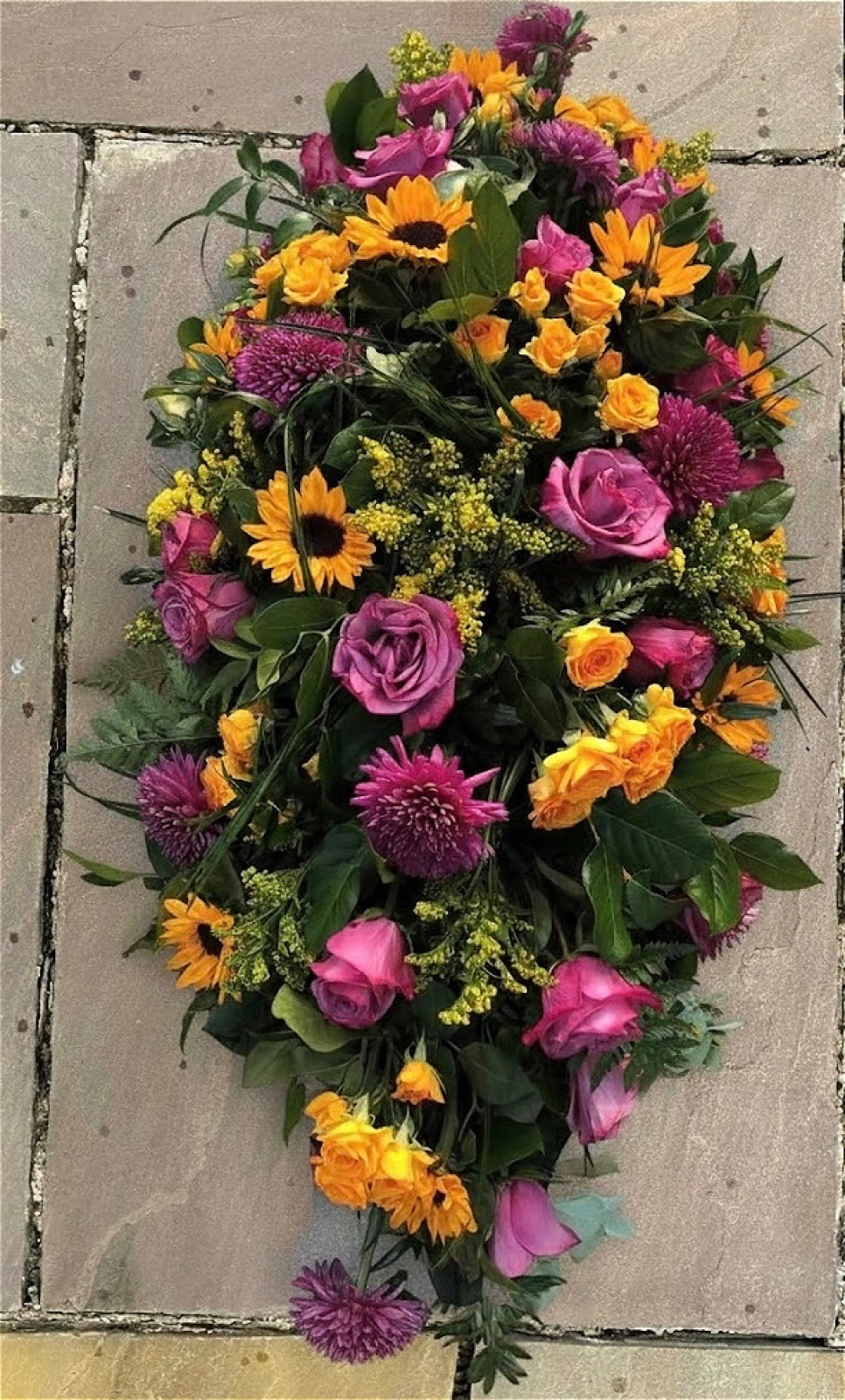 Our Yellow & Purple Double Ended Spray is a stunning vibrant tribute to honour a loved one. The bright yellow tones shine throughout the design complementing the beautiful purple. This design could also be used for an event as a display piece. Please select which size you want using the drop down menu. The image shown is an example and not exact, meaning flower sizes/shapes/varieties may differ due to seasonal availability.